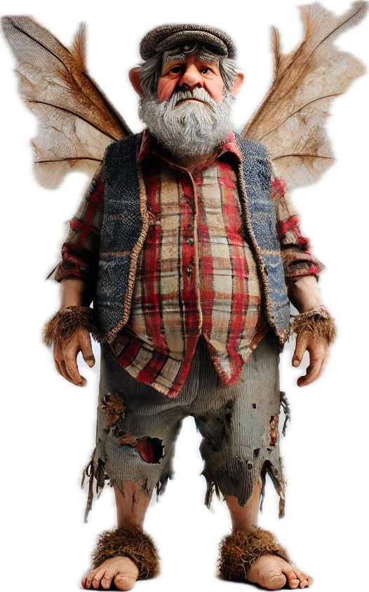 Bud is the wise and weathered elder of the Trailer Park Fairy Gardens, a figure of quiet strength and steadfast resilience. With his bushy beard, kind eyes, and a face etched with the lines of countless stories, Bud embodies the spirit of a life well-lived. He wears a patched-up plaid shirt under a cozy, worn vest, paired with raggedy shorts that speak to his rugged, no-frills approach to fairy life. His furry wrist and ankle cuffs hint at his deep connection to nature and the earth beneath his feet.