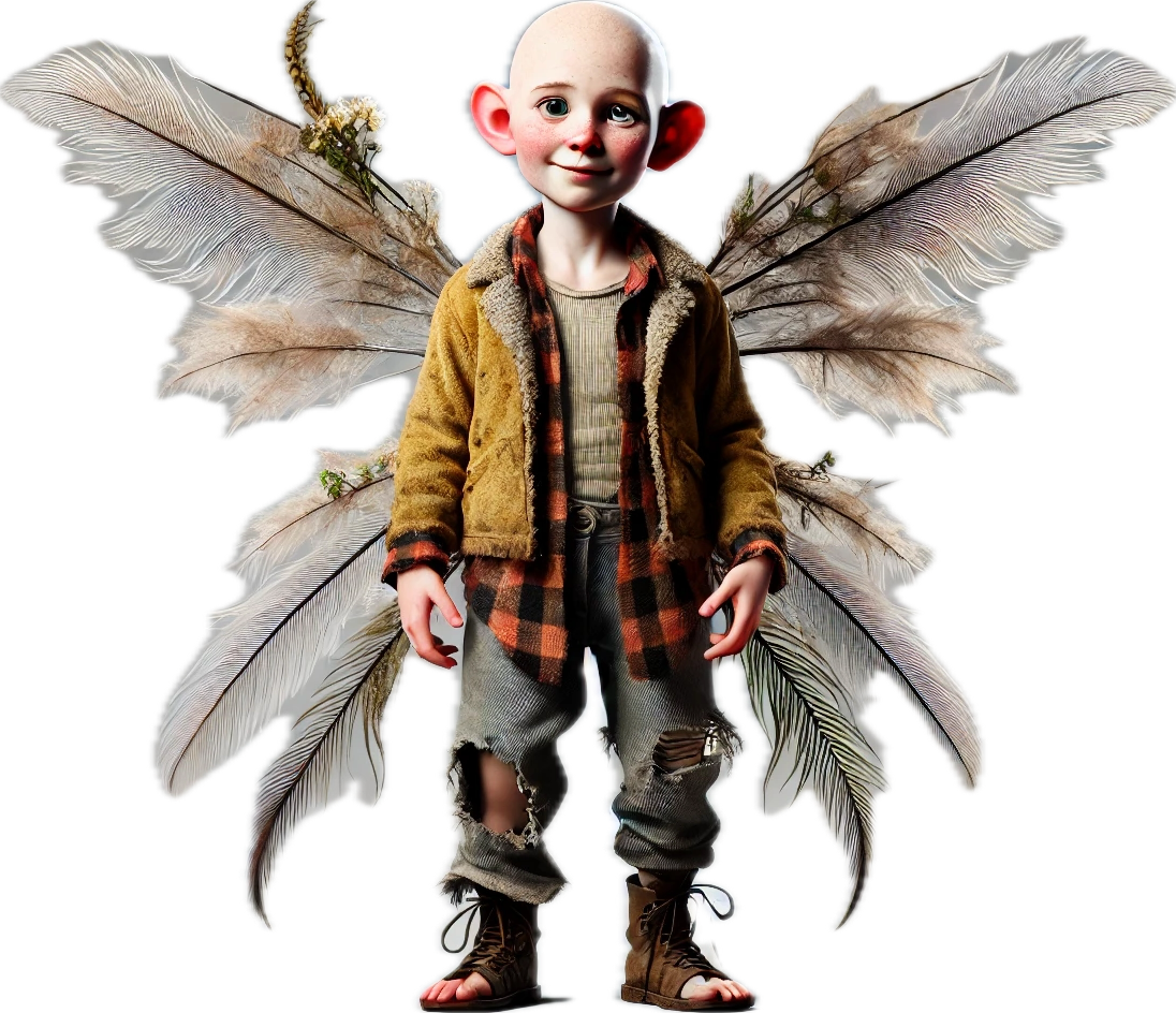 Cletus’s wings are broad and feather-like, resembling the delicate plumage of a woodland bird. They bear a few natural embellishments—bits of twigs, small flowers, and leaves caught in their fibers, giving him an earthy, rustic charm. His wings flap gently as he moves, often accompanied by a few curious birds or butterflies drawn to his calm and nurturing aura.