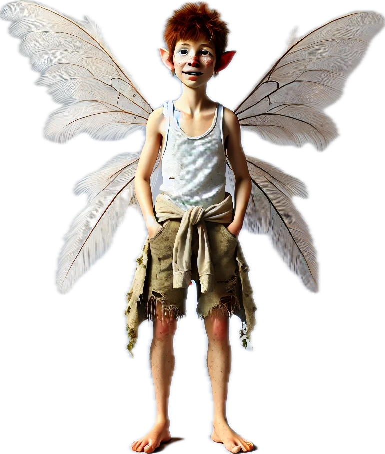 Dale is the sprightly and fun-loving fairy of the Trailer Park Fairy Gardens, always ready for a bit of mischief or a spontaneous adventure. With his bright eyes, freckled face, and tousled red hair, Dale has an infectious energy that brings a smile to everyone he meets. His outfit is as carefree as his spirit—a simple, slightly torn tank top and a pair of frayed shorts, with a cozy sweater tied around his waist, perfect for those cool twilight flights.
