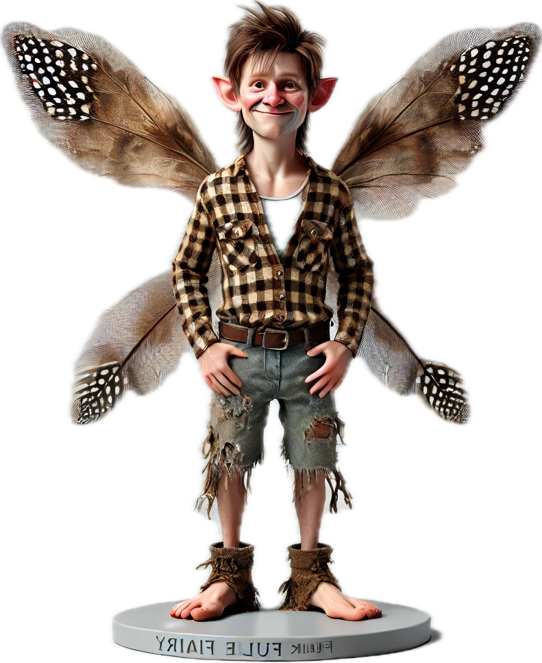 Darlle is the sharp-witted and stylish fairy of the Trailer Park Fairy Gardens, known for his confident grin and keen sense of humor. With his slightly tousled hair and mischievous glint in his eyes, Darlle always looks like he’s just thought of a clever quip. His choice of attire—a checkered flannel shirt neatly tucked into his distressed denim shorts—gives him a rustic yet polished look that perfectly complements his playful personality. His outfit, complete with a well-worn belt and fairy fuzz adorning his ankles, speaks to his rugged charm.